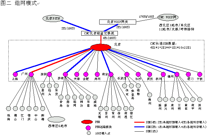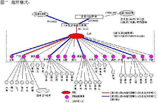 網通的客戶服務系統(tǒng)(1003呼叫中心)包括位于北京總部的總中心及其它全國30多個城市的分中心,全國范圍共有近200個接入點(覆蓋城市),共有200余座席,由總中心,交換機遠端模塊接入點子中心及軟覆蓋接入點組成的三層架構。參見下圖一《系統(tǒng)架構》及圖二《組網模式》。