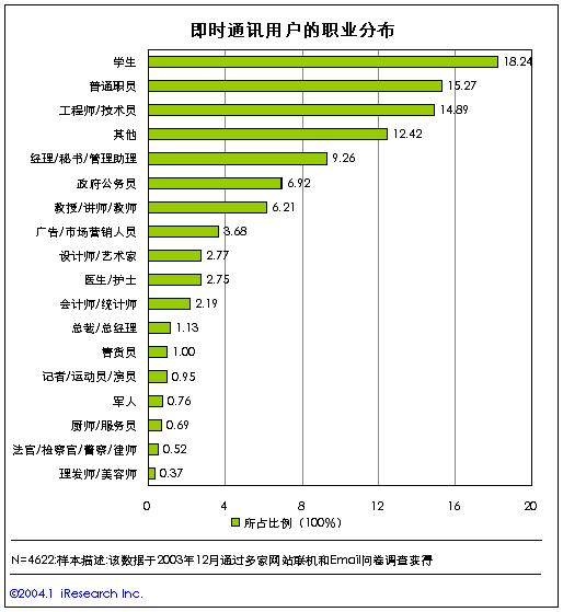 從即時(shí)通訊用戶的職業(yè)結(jié)構(gòu)來(lái)看,在中國(guó)的即時(shí)通訊用戶中,學(xué)生、普通公司職員、工程技術(shù)人員構(gòu)成了最主要的用戶群體,其中學(xué)生的比例最高,達(dá)到了18.24%?撮_(kāi)學(xué)生是中國(guó)即時(shí)通訊的生力軍。