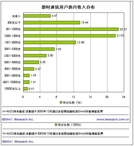 從即時(shí)通訊用戶的學(xué)歷水平來(lái)分析,在目前的即時(shí)通訊用戶中,大專(zhuān)以上教育程度的用戶比例達(dá)到了75%,占據(jù)了絕對(duì)高的比例。顯示出即時(shí)通訊用戶的整體教育水平非常高。