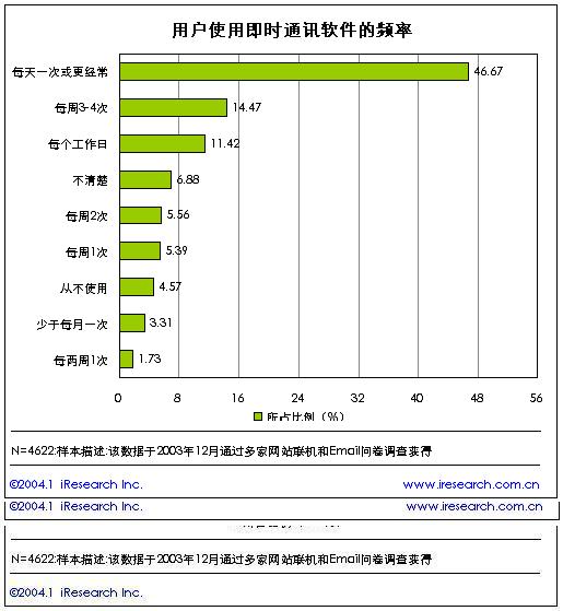根據(jù)艾瑞市場(chǎng)咨詢(iResearch)的《2003年中國(guó)即時(shí)通訊研究報(bào)告》研究結(jié)果表明,在中國(guó)的即時(shí)通訊用戶中,72%的即時(shí)通訊用戶為男性,占據(jù)了大部分份額。女性用戶僅僅占28%。看來(lái)男性網(wǎng)民更喜歡在網(wǎng)上聊天。