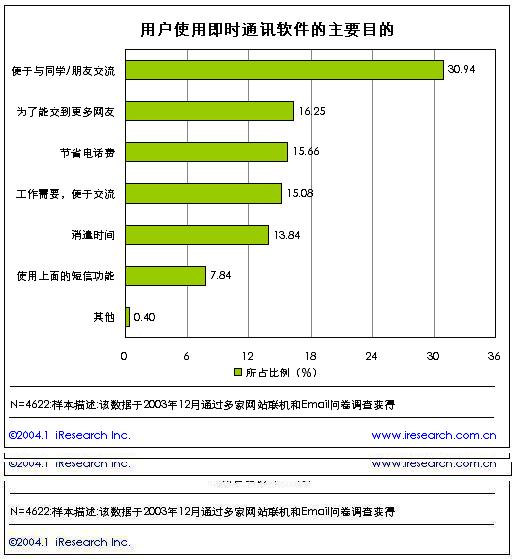 即時(shí)通訊作為網(wǎng)民最常使用的應(yīng)用之一,即時(shí)通訊的多功能性可以滿足用戶的不同需求,達(dá)到不同的目的,根據(jù)艾瑞市場(chǎng)咨詢(iResearch)的研究結(jié)果,在問(wèn)及用戶使用即時(shí)通訊的目的時(shí),有31%的用戶選擇了“便于與同學(xué)/朋友交流”作為使用即時(shí)通訊軟件的最主要的目的,16%的用戶選擇“為了交到更多的朋友”作為作主要的目的,兩者相加的比例接近了50%。說(shuō)明與朋友、網(wǎng)友間的交流聊天仍然是即時(shí)通訊軟件的最主要的功能。同時(shí),即時(shí)通訊軟件用戶一般還同時(shí)使用包括文件傳送、語(yǔ)音聊天、郵件檢查、群組聊天、手機(jī)綁定等其他功能。而文件傳輸是其中最主要的一項(xiàng)功能。