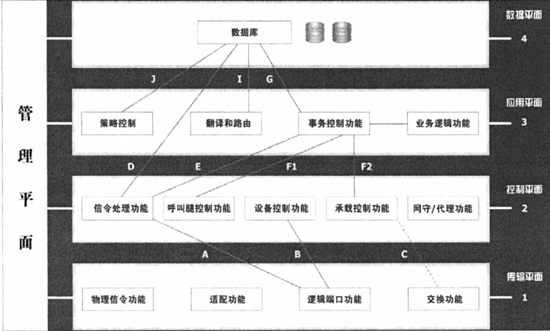 控制平面處于第二層,提供控制功能,如信令處理、承載連接控制、設(shè)備控制、呼叫腿(Leg)控制、網(wǎng)守(Gatekeeper)和代理信令等功能。其中:參考點D位于信令處理功能和數(shù)據(jù)庫功能之間,采用TCAP信令;參考點E在信令處理功能和會話控制功能之間,采用TCAP信令,用于IN請求等傳送,業(yè)務(wù)邏輯對呼叫的控制等消息傳送;參考點F1、F2分別采用呼叫控制API和承載連接控制API,如TAPI、JTAPI等。控制平面與外界的接口2采用H.323(H.225/H.245)、SIP、TCAP(TCAP/SCCP/M3UA/SCTP/IP)等協(xié)議和信令。