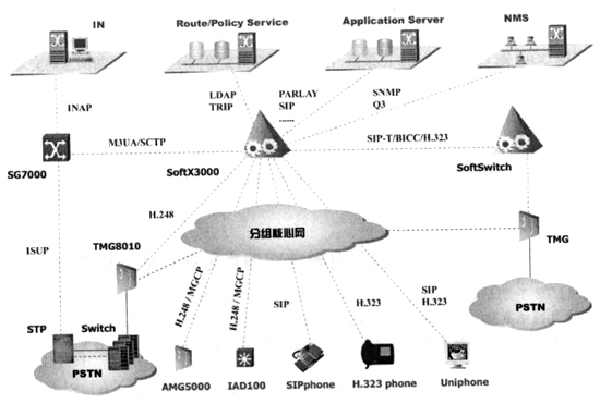 控制層組成主要是軟交換設(shè)備。軟交換通過與各種媒體網(wǎng)關(guān)的交互作用,實現(xiàn)不同網(wǎng)絡(luò)之間的業(yè)務(wù)層融合。