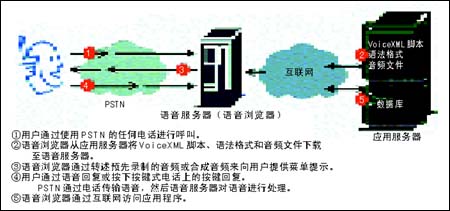為了更好地理解VoiceXML 2.0,可以將VoiceXML和HTML進(jìn)行類比。采用HTML的Web應(yīng)用可以分為兩部分:瀏覽器和Web服務(wù)器。相應(yīng)地,VoiceXML涉及的組件也可分為語音瀏覽器和相當(dāng)于Web服務(wù)器功能的應(yīng)用服務(wù)器。