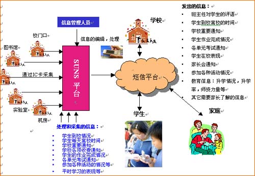 從上圖可以看到,在建立了SUNS校園綜合管理短信平臺以后,學生在校的活動可以通過信息采集系統(tǒng)收集,在進行后臺信息處理的同時,建立一個與學生家庭直接溝通渠道。