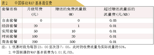 1X的優(yōu)勢(shì)是技術(shù)先進(jìn),速度快,但部分地區(qū)網(wǎng)絡(luò)覆蓋不足,開通國(guó)際漫游數(shù)據(jù)業(yè)務(wù)的國(guó)家少。此外,在收費(fèi)上雙方也有不同。表2是中國(guó)移動(dòng)與中國(guó)聯(lián)通WAP基本通信費(fèi)比較(各省之間略有不同)。