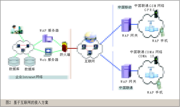 企業(yè)應(yīng)用系統(tǒng)要支持WAP應(yīng)用必須與中國(guó)移動(dòng)和中國(guó)聯(lián)通的移動(dòng)網(wǎng)絡(luò)建立連接。根據(jù)應(yīng)用的安全性要求和數(shù)據(jù)流量,有以下兩種接入方案可供選擇。