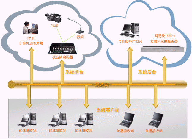- 系統(tǒng)后臺:連接在網(wǎng)絡上即可,接受REN-1服務器管理端發(fā)送來的系統(tǒng)管理、維護指令,并負責將系統(tǒng)前臺發(fā)送來的視頻、音頻、計算機動態(tài)屏幕進行實時錄制和直播,它包括:網(wǎng)易錄媒體中心(REN-1),它為系統(tǒng)的核心,主要完成視頻、音頻、計算機動態(tài)屏幕的錄制和直播;