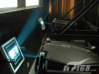 為了達到足夠大的尺寸,主屏幕采用SEAPRINE圖像控制器組成的1*2拼接,也就是采用了兩臺BARCO G5投影機來確保畫面的一流效果。不過由于投影距離的限制,這個方案里采用了二次反射系統(tǒng)。這也是這套方案的一個要點和關(guān)鍵。因為很多工程師利用一些概率來估算一次或多次折射可以縮短的投影距離,但欠缺科學和嚴謹?shù)膽B(tài)度,因為這個數(shù)據(jù)與屏幕安裝高度、投影方式(離軸或偏軸)、投影機體積、反射鏡面積等息息相關(guān)。