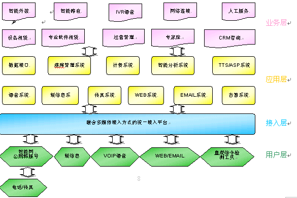 呼叫中心是比較特別的產(chǎn)業(yè),從其技術(shù)的跨度上來看,CTI本身就是融合了現(xiàn)代通信技術(shù)及現(xiàn)代計(jì)算機(jī)技術(shù),在通信技術(shù)方面,新一代的呼叫中心不但能提供普通的語音服務(wù),還要具備先進(jìn)的語音服務(wù)功能,如ASR、TTS,以及Web呼叫、短信提醒、BP機(jī)服務(wù)、收發(fā)傳真、Email