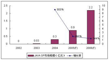 作為SP和移動運營商都非常看好的業(yè)務(wù),JAVA業(yè)務(wù)受到眾多SP的青睞。盡管作為JAVA主要業(yè)務(wù)的手機游戲目前盈利狀況普遍欠佳,但空中網(wǎng)、美通無線、數(shù)字魚等SP仍然大量投入,期待著未來業(yè)務(wù)的高速增長。受制于終端和JAVA游戲的表現(xiàn)力,2005年JAVA業(yè)務(wù)的SP市場規(guī)模增長率回落到200%,諾盛預(yù)計2006年JAVA的使用環(huán)境沒有太大變化,其增長率進一步回落至144%。