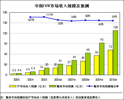 iResearch通過研究分析,2005年中國(guó)IVR市場(chǎng)總體收入規(guī)模(包括通信費(fèi)及信息費(fèi))為20億元,2006年將達(dá)到31億元,預(yù)計(jì)到2010年將達(dá)到128億元,市場(chǎng)增長(zhǎng)率將呈現(xiàn)逐步下降的趨勢(shì)。其中IVR市場(chǎng)中SP的收入規(guī)模在2005年為13億元,2006年將達(dá)到20億元。