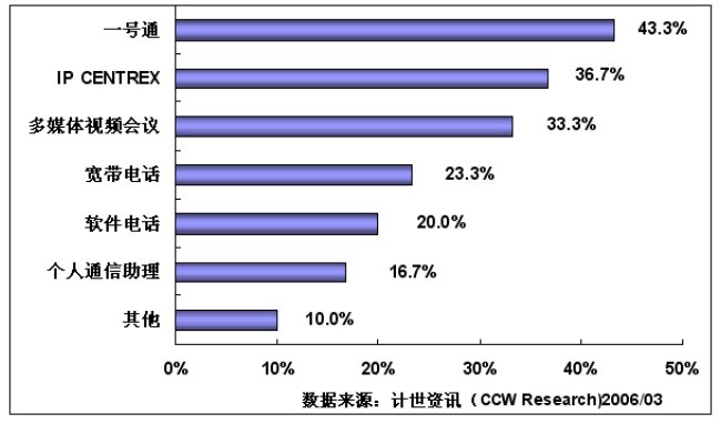 通過(guò)計(jì)世資訊(CCW Research)的調(diào)研可以看到,行業(yè)用戶對(duì)一號(hào)通、IP-CENTREX、多媒體視頻會(huì)議和寬帶電話等基于NGN平臺(tái)開(kāi)發(fā)的業(yè)務(wù)比較感興趣,其中:對(duì)一號(hào)通感興趣的用戶達(dá)到43.3%,對(duì)IP-CENTREX感興趣的用戶為36.7%,對(duì)多媒體視頻會(huì)議感興趣的用戶達(dá)到33.3%,對(duì)寬帶電話感興趣的用戶達(dá)到23.3%,對(duì)軟件電話感興趣的用戶達(dá)到20.0%,對(duì)個(gè)人通信助理感興趣的用戶達(dá)到16.7%。
