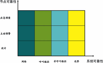 呼叫中心可靠性模型的每個(gè)維度都有一些設(shè)備/軟件節(jié)點(diǎn)組成,每個(gè)維度的可靠性需要通過組成節(jié)點(diǎn)以及節(jié)點(diǎn)之間鏈路的可靠性來實(shí)現(xiàn),節(jié)點(diǎn)可靠性的實(shí)現(xiàn)可以抽象為3個(gè)層次:設(shè)計(jì)可靠性、主動(dòng)預(yù)警能力和應(yīng)急預(yù)案。通過對(duì)所有節(jié)點(diǎn)3個(gè)層次的可靠性分析,可以實(shí)現(xiàn)可靠性模型每個(gè)維度的可靠性,從而實(shí)現(xiàn)系統(tǒng)可靠性。根據(jù)圖2的可靠性分析矩陣,可以建立呼叫中心可靠性分析方法。