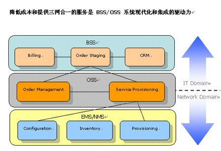我們可以看到,集成現(xiàn)存的OSS/BSS即 NMS/EMS 是 三網(wǎng)合一的必然要求。 然而傳統(tǒng)的EAI和BPM集成產(chǎn)品是被設(shè)計(jì)成滿足IT部門集成CRM或ERP等應(yīng)用的需要,很少被用于OSS層面,原因很簡(jiǎn)單:BSS中的系統(tǒng)多半是單一廠商提供的,只和BSS中的特定應(yīng)用打交道。然而,