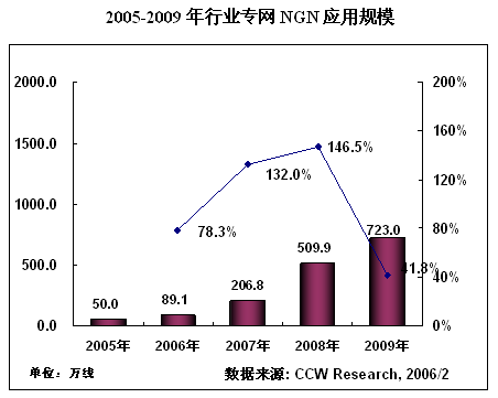在運(yùn)營(yíng)商N(yùn)GN建設(shè)高速增長(zhǎng)的同時(shí),政府、能源、交通等行業(yè)專網(wǎng)NGN建設(shè)也逐漸步入快車(chē)道。NGN在行業(yè)專網(wǎng)的應(yīng)用,到2005年底的應(yīng)用規(guī)模達(dá)到50萬(wàn)線,根據(jù)計(jì)世資訊(CCW Research)《2005-2006中國(guó)NGN產(chǎn)業(yè)應(yīng)用趨勢(shì)研究報(bào)告》的預(yù)測(cè),未來(lái)4年,NGN在行業(yè)專網(wǎng)市場(chǎng)將以95%的復(fù)合增長(zhǎng)率高速增長(zhǎng)。