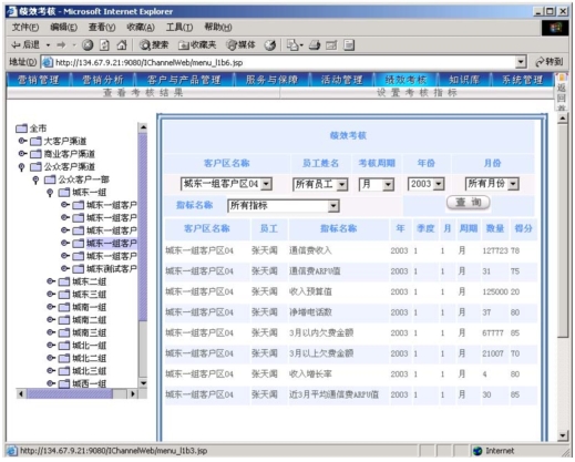 作為電信營(yíng)銷服務(wù)支撐系統(tǒng),其主要功能是支撐營(yíng)銷人員開展?fàn)I銷活動(dòng),并通過(guò)功能完善的考核系統(tǒng)幫助各級(jí)人員進(jìn)行工作管理。本系統(tǒng)可以對(duì)KPI指標(biāo)進(jìn)行靈活的設(shè)定,可以靈活定義多種參與考核的數(shù)據(jù)來(lái)源,使得各級(jí)主管能夠?qū)蛻艚M、社區(qū)(商業(yè)客戶區(qū)、農(nóng)村統(tǒng)包區(qū))的營(yíng)銷服務(wù)工作進(jìn)行考核評(píng)分?己酥芷诳梢酝ㄟ^(guò)參數(shù)進(jìn)行設(shè)定(一般以月為單位)。