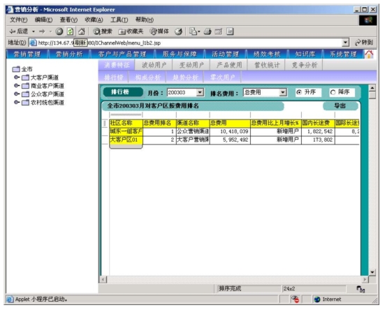 本系統(tǒng)是以市場(chǎng)為導(dǎo)向、客戶為中心、效益為目標(biāo)的電信營(yíng)銷和服務(wù)的支撐系統(tǒng),為企業(yè)經(jīng)營(yíng)服務(wù)和營(yíng)銷戰(zhàn)略提供有力的支撐,通過(guò)對(duì)業(yè)務(wù)收入、業(yè)務(wù)發(fā)展以及市場(chǎng)競(jìng)爭(zhēng)的深入分析,從而達(dá)到留住老客戶、發(fā)現(xiàn)新客戶,了解競(jìng)爭(zhēng)對(duì)手動(dòng)態(tài),及時(shí)掌握市場(chǎng)變化趨勢(shì)的目的。