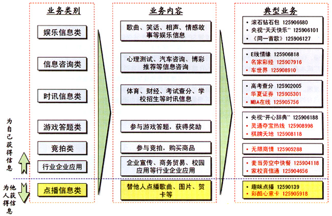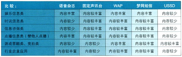 - 時(shí)訊信息類和信息咨詢類業(yè)務(wù),IVR優(yōu)勢較強(qiáng),但業(yè)務(wù)范圍較窄,內(nèi)容較少,收入貢獻(xiàn)較低,同時(shí)部分業(yè)務(wù)容易受到SP信息源的制約。如果能進(jìn)一步完善服務(wù),滿足用戶需求,業(yè)務(wù)將迅速發(fā)展,應(yīng)該定位于IVR短期發(fā)展的重點(diǎn)業(yè)務(wù)。