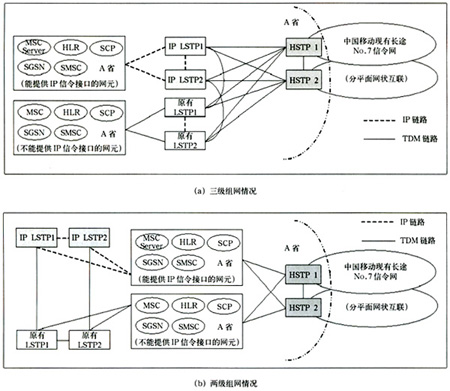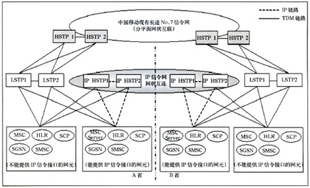 由于該方案下,不支持IP信令的網(wǎng)元同時(shí)與原有LSTP和新建的IP LSTP都連接,因此需要這些網(wǎng)元能夠判斷出對(duì)端省哪些網(wǎng)元支持IP信令,并選擇正確的路由(可以考慮通過(guò)為支持IP信令的網(wǎng)元設(shè)置特殊號(hào)段ID號(hào)的方式實(shí)現(xiàn));蛘咭部梢宰尣恢С諭P信令的網(wǎng)元只與現(xiàn)有LSTP相連,由LSTP負(fù)責(zé)判斷將省際信令送至現(xiàn)有長(zhǎng)途信令網(wǎng)還是IP信令網(wǎng)(同樣要求LSTP能夠判斷對(duì)端省哪些網(wǎng)元支持IP信令),但會(huì)增加信令的跳數(shù)(三級(jí)組網(wǎng))。考慮到今后信令I(lǐng)P化的趨勢(shì),為節(jié)省投資,不建議新建的支持IP信令的網(wǎng)元再配置TDM信令接口,這些網(wǎng)元只通過(guò)IP接口與IP LSTP相連。