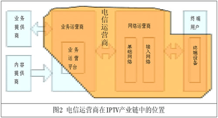根據(jù)以上的分析,可以看出,電信運(yùn)營商在IPTV產(chǎn)業(yè)鏈中居于主導(dǎo)地位,但與廣電部門的關(guān)系仍然需要理順,才能真正在IP網(wǎng)絡(luò)上發(fā)展好視頻類業(yè)務(wù)。圖2示意了電信運(yùn)營商在IPTV中的位置。