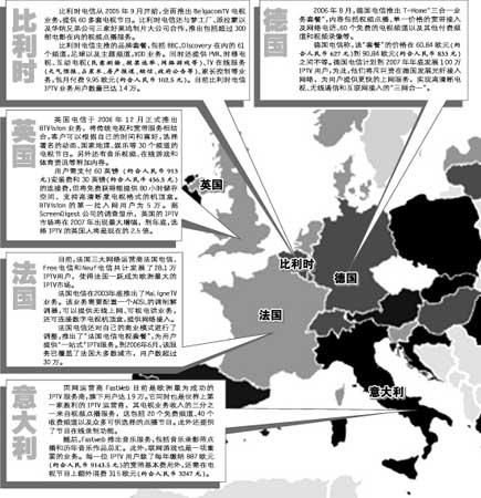 對于歐洲觀眾來說,IPTV(網(wǎng)絡付費電視)就是他們未來的生活主畫面之一。他們只需每月交付30歐元(約合人民幣309元)到60歐元(約合人民幣618元)的費用,便可在電視或電腦上選擇收看上百個頻道的電視節(jié)目。歐洲雖然缺乏強大的衛(wèi)星網(wǎng)絡作為技術支持,不過卻擁有多家實力雄厚的電信營運商,這些巨頭們擁有相同的興趣和市場,正考慮是否聯(lián)合經(jīng)營,共同分食歐洲網(wǎng)絡電話電視市場這塊“大蛋糕”。