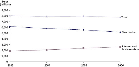 但問題是,在發(fā)達國家,用戶寬帶接入市場已經(jīng)接近飽和。正因為是這樣一種情況,所以用戶數(shù)量也就很難再有增加。ARPU值在極大的競爭壓力下也很難有很大的突破。一切都靜止不動,固話收入持續(xù)下降,所以圖中的“'Internet