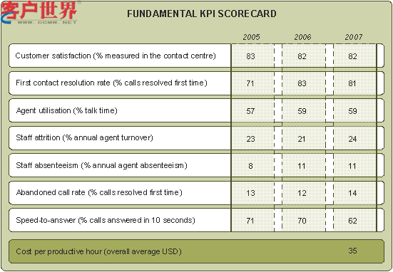 一次問題解決率的記分已經(jīng)作為定義和測量標準擁有了更高的協(xié)調(diào)性,但是人工座席利用率,生產(chǎn)力的代名詞,應(yīng)該受到更多的關(guān)注,因為它是合理規(guī)劃和管理資源的一個重要體現(xiàn)。員工離職率測評的是平均年流失率,是檢測人力資源管理效率的一項重要指標。除了像處理今年24%的流失率所付出的高成本和努力外,客戶服務(wù)的間接成本也是值得注意的。員工曠工對企業(yè)來說是無法計算的損失。注重激情,提高滿意度和激發(fā)員工的主動性是解決這項問題的關(guān)鍵點。電話放棄率統(tǒng)計顯示有十分之一的來電者會放棄再次來電,因此呼叫中心要滿足客戶的期望還有很長的路要走。接聽速度的記分統(tǒng)計中10秒的接聽記錄有所下降,但是20秒的接聽標準有整體的提高。生產(chǎn)小時成本是計算提供特定服務(wù)實際成本的標準尺度,同時也是了解呼叫中心每個生產(chǎn)小時所需的投資成本的重要依據(jù)。