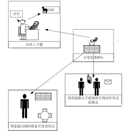 DoCoMo公司網(wǎng)里現(xiàn)有這類(lèi)手機(jī)共37種),通過(guò)無(wú)線(xiàn)方式與免費(fèi)IP包傳輸中繼器相連,免費(fèi)IP包傳輸中繼器通過(guò)以太網(wǎng)經(jīng)過(guò)寬帶路由器或通過(guò)PPPoE(Point