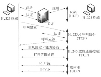 H.323終端之間建立通信關(guān)系通常執(zhí)行四個(gè)控制過程:RAS,H.225.0呼叫控制(Q.931信令),連接控制(H.245)及媒體RTP信道建立的過程。