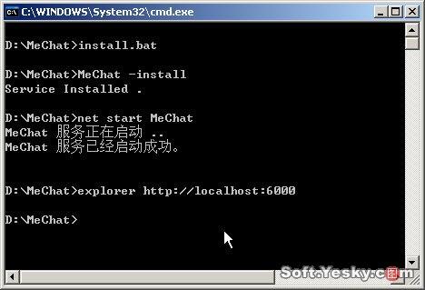 說(shuō)明:MeChat目錄中還有一個(gè)Run、bat,該文件用于測(cè)試MeChat服務(wù)器。假如安裝MeChat時(shí)Run、bat的命令窗口還開著,則務(wù)必先關(guān)閉此窗口再執(zhí)行install、bat。另外,雙擊執(zhí)行該目錄下的uninstall、bat批處理文件可以停止并刪除系統(tǒng)中的MeChat服務(wù)。