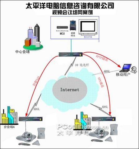 該方案有很強(qiáng)的針對性,作為主會(huì)場必須用10兆/20兆光纖接入INTERNET,且需要視頻交換處理設(shè)備MCU,而太平洋電腦網(wǎng)本身就具備雄厚的服務(wù)器作為基礎(chǔ)。廣州總公司還需要較高配置的視頻終端設(shè)備,在局域網(wǎng)網(wǎng)關(guān)上安裝較高配置路由器,主會(huì)場可以通過設(shè)置MCU隨時(shí)使某一分會(huì)場成為主席。