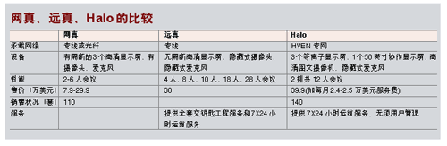 惠普的Halo工作室系統(tǒng)強調(diào)可用于企業(yè)遠程模擬面對面業(yè)務(wù)會議。通過Halo連接,每個Halo工作室可支持會議桌前排六人,第二排三至六人,最多12人的會議規(guī)模。每個工作室有三臺等離子顯示器,參會人員能夠看到與本人同樣大小的圖像。另外,參會者還可使用一個安裝在等離子顯示器上方的50英寸的協(xié)作屏幕,與其他Halo工作室中的人員共享其筆記本電腦中的文件與數(shù)據(jù)。工作室還包括一個高清圖文攝像機,可用于拍攝桌上的物品并顯示在協(xié)作顯示器上,真實呈現(xiàn)色彩、陰影與細微之處。同時配備的電話讓與會者可以與Halo工作室外的人員聯(lián)系。工作室配備了廣播質(zhì)量的音頻與照明設(shè)施,參會者可以使用屏幕上簡便的用戶界面,通過點擊鼠標開始協(xié)作。一個復(fù)雜的軟件控制系統(tǒng)將確保各個Halo工作室輕松、無縫地協(xié)同工作。
