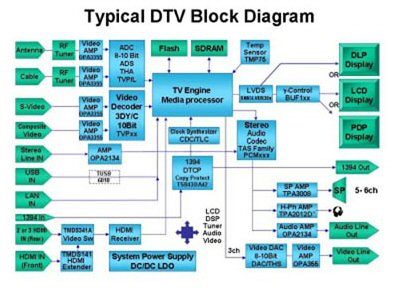 一般來說,數(shù)字電視可以被分解為不到10個(gè)主要的模塊:顯示器(和驅(qū)動(dòng)器)、核心媒體引擎、音頻編解碼和處理、視頻編解碼和處理、調(diào)諧器、接口模塊和電源。對每一個(gè)模塊的絕對性能要求由你最喜歡的座位的舒適體驗(yàn)的性能水平來定義。