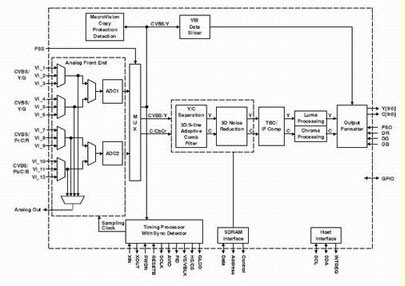圖2所示為視頻解碼器的數(shù)據(jù)流路徑,它負(fù)責(zé)處理NTSC、PAL、SECAM、S-Video、SCART、YPbPr、RGB、480p和其它輸入格式。在數(shù)字電視中,對這種級別的靈活性的支持是必需的,完全是為了讓一個(gè)機(jī)型經(jīng)過實(shí)際設(shè)置可以工作于任何格式。數(shù)字電視解碼器的典型性能特征包括:同步、消隱、場、有源視頻窗口、水平和垂直同步、時(shí)鐘、同步鎖相(用于下行視頻編碼同步)、主CPU中斷和可編程邏輯I/O信號。這是對數(shù)字視頻輸出以及用于先進(jìn)的垂直消隱期(VBI)數(shù)據(jù)恢復(fù)的補(bǔ)充。作為一種附加功能,一些視頻解碼器支持VBI數(shù)據(jù)處理器(VDP)在文字電視廣播、傳送字幕(CC)和其它VBI數(shù)據(jù)上進(jìn)行數(shù)據(jù)分片、解析和執(zhí)行誤碼校驗(yàn)。內(nèi)置的FIFO存儲(chǔ)多達(dá)11行文字電視廣播數(shù)據(jù),而適當(dāng)?shù)闹鹘涌谕郊叭聊晃淖蛛娨晱V播恢復(fù)是當(dāng)今系統(tǒng)中的幾個(gè)常見要求。然而,一些實(shí)現(xiàn)方案需要一種解碼器,它能夠?yàn)榛谥鰿PU的VBI處理提供速度為已采樣原始亮度數(shù)據(jù)兩倍的輸出格式化數(shù)據(jù)。