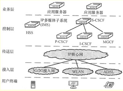 IMS使用會(huì)話發(fā)起協(xié)議(SIP)作為建立、控制、修改和終止兩個(gè)或者更多個(gè)參與者之間的語(yǔ)音、視頻和消息等會(huì)話的信令協(xié)議。在IMS中,與SIP相關(guān)的信令點(diǎn)稱(chēng)為呼叫狀態(tài)控制功能信令點(diǎn),并且根據(jù)它們功能的不同而有所區(qū)分。IMS中與鑒權(quán)、授權(quán)、計(jì)費(fèi)相關(guān)的功能基于IETF、Diameter協(xié)議,是在HSS、CSCF等IMS組件上實(shí)現(xiàn)的,提供業(yè)務(wù)收費(fèi)功能。HSS是與用戶和服務(wù)相關(guān)的數(shù)據(jù)的主要存儲(chǔ)器,由2G移動(dòng)通信網(wǎng)的HLR演進(jìn)而來(lái)。業(yè)務(wù)層上的應(yīng)用服務(wù)器提供各種業(yè)務(wù)邏輯,實(shí)現(xiàn)多種電信增值業(yè)務(wù)。傳送層的IP核心網(wǎng)是IMS業(yè)務(wù)的統(tǒng)一承載網(wǎng)絡(luò)。接入層提供包括2G、3G(UMTS、cdma2000)、WLAN、ADSL等在內(nèi)的多種接入方式。