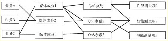 對(duì)于基于IMS的下一代網(wǎng)絡(luò)來(lái)說(shuō),QoS參數(shù)和業(yè)務(wù)的相關(guān)關(guān)系比較復(fù)雜。對(duì)于一個(gè)IMS業(yè)務(wù),需要保障其包含的所有的媒體成分的服務(wù)質(zhì)量。將IMS業(yè)務(wù)的QoS要求分解為可測(cè)量的網(wǎng)絡(luò)參數(shù)的過(guò)程如圖2所示。