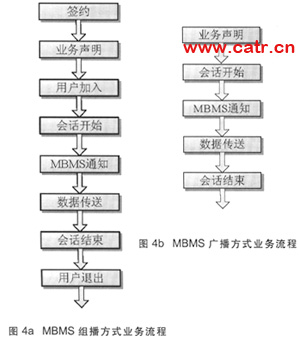 MBMS可應用組播模式和廣播模式兩種業(yè)務模式。廣播模式接近于數(shù)字電視業(yè)務,而組播模式專注和定位于群業(yè)務。組播模式提供了更好的計費特性,包括服務訂閱、接入和推出功能,需要用戶簽約相應組播組,進行業(yè)務激活,并產生相應的計費信息,而廣播業(yè)務不需要小區(qū)中所有用戶都制定該業(yè)務便可以獲得。由于組播和廣播模式在業(yè)務需求上存在不同,導致其業(yè)務流程也不同(見圖4a、圖4b)。