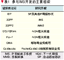3GPP采用和其他標(biāo)準(zhǔn)化組織密切合作的方式制訂IMS技術(shù)標(biāo)準(zhǔn),并依靠各國通信界的協(xié)同不斷發(fā)展和完善(如表1所示)。其中,最重要的合作就是和IETF聯(lián)合開發(fā)了IMS網(wǎng)絡(luò)的核心控制協(xié)議SIP[1],共同研究SIP的擴(kuò)展和應(yīng)用。另一個(gè)重要的合作是和Parlay組織聯(lián)合開發(fā)了支持開放式業(yè)務(wù)提供的Parlay/開放業(yè)務(wù)接入(OSA)應(yīng)用程序接口(API),將源于固定智能網(wǎng)結(jié)構(gòu)開放的Parlay技術(shù)引入IMS網(wǎng)絡(luò)的OSA結(jié)構(gòu)[2]。最重要的協(xié)同就是ETSI的TISPAN研究組和ITU-T提出了IMS中融入固定接入的技術(shù)[3],另一個(gè)重要的協(xié)同是OMA組織提出了許多基于IMS實(shí)現(xiàn)的業(yè)務(wù)規(guī)范和技術(shù)[4]。