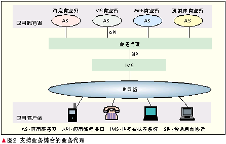 經(jīng)過多年的探索,業(yè)界取得共識(shí)網(wǎng)絡(luò)演進(jìn)必須基于業(yè)務(wù)驅(qū)動(dòng)的策略。必須指出的是,雖然基于SIP技術(shù)的IMS支持的業(yè)務(wù)從語音業(yè)務(wù)擴(kuò)展到了寬帶多媒體業(yè)務(wù),然而其控制機(jī)理本質(zhì)上還是源于傳統(tǒng)電信網(wǎng),因此它最適合于提供的還是諸如VoIP、集群話音、集群視頻等實(shí)時(shí)會(huì)話型業(yè)務(wù),諸如Web、電子商務(wù)等純數(shù)據(jù)型業(yè)務(wù)并不適合由IMS提供,其他許多有前景的業(yè)務(wù),如流媒體業(yè)務(wù)、IPTV、消息類業(yè)務(wù)等的確IMS已提出或正在積極研究其提供方法,但是已有其他的非IMS提供方式。因此,切不要認(rèn)為IMS是包羅萬象的,更確切地說,IMS是電信界提出的網(wǎng)絡(luò)融合技術(shù),考慮得更多的必然就是和傳統(tǒng)電信業(yè)務(wù)模式類似的業(yè)務(wù)。為了使IMS在未來融合的信息通信網(wǎng)絡(luò)中繼續(xù)保持其重要的地位,在積極研究擴(kuò)大IMS業(yè)務(wù)能力的同時(shí),必須研究新的體系結(jié)構(gòu)既能夠包容IMS型業(yè)務(wù),也能夠包容非IMS型業(yè)務(wù),由此形成融合的開放式的業(yè)務(wù)平面。這就是熱點(diǎn)研究之中的業(yè)務(wù)代理技術(shù),實(shí)際上就是架構(gòu)在IMS之上的綜合業(yè)務(wù)平臺(tái),如圖2所示。它至少能夠提供4大類業(yè)務(wù):IMS類業(yè)務(wù)、消息類業(yè)務(wù)、流媒體業(yè)務(wù)、Web業(yè)務(wù)以及它們的組合,也就是說,除了IMS系統(tǒng)的SIP協(xié)議和API以外,業(yè)務(wù)平臺(tái)還應(yīng)能支持其他眾多的非IMS系統(tǒng)協(xié)議和接口,由此構(gòu)成融合的業(yè)務(wù)層。IMS系統(tǒng)是其中的一個(gè)重要組成部分,擔(dān)負(fù)起通信網(wǎng)絡(luò)的融合重任。