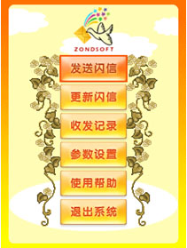 “閃信”的主操作界面設計簡潔、顏色以明快的橙色位置。功能選項整齊的排列在屏幕中央。功能項共分為6大項“發(fā)送閃信、收發(fā)記錄、更新閃信、參數(shù)設置、使用幫助、退出系統(tǒng)”功能項的設置簡潔,功能名稱使人看過之后就可以迅速理解了各個選項的功能重點。