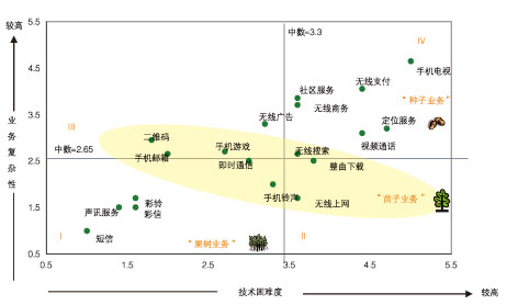根據“業(yè)務復雜性—技術困難度”模型,可以清晰地看到一個業(yè)務的成功商用和業(yè)務復雜性與技術困難度密切相關,如短信和彩鈴等復雜性與技術困難度都很低的業(yè)務是比較容易成功商用的,將這一類業(yè)務歸類為“果樹業(yè)務”,在第一象限(象限I)。還有一些業(yè)務如即時通信、整曲下載和無線搜索等業(yè)務,已經開始快速增長但是其用戶規(guī)模和收入量都還低于“果樹業(yè)務”,在業(yè)務復雜性與技術困難度坐標中這類業(yè)務處于4個象限交匯的中部區(qū)域(即圖中黃色區(qū)域),由于業(yè)務復雜性和技術困難度都會隨時間而減小,從而這一區(qū)域的業(yè)務會向第一象限演進,這類業(yè)務稱為“苗子業(yè)務”,即在3年內能夠成熟的業(yè)務。在坐標系的右上角第四象限,即業(yè)務復雜性和技術困難度均較高的業(yè)務,稱之為“種子業(yè)務”,這類業(yè)務在短期內很難快速成長。