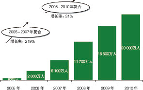 從2005年到2010年,預計中國無線搜索用戶數量的變化如圖4所示。