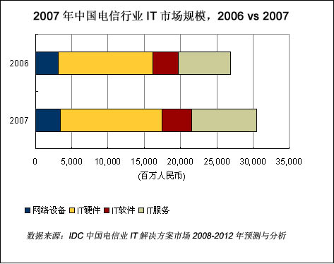 IDC《中國(guó)電信行業(yè)IT解決方案市場(chǎng)2008-2012年預(yù)測(cè)與分析》報(bào)告的數(shù)據(jù)顯示,2007年中國(guó)電信行業(yè)整體IT支出規(guī)模為305.02億元人民幣,比2006年增長(zhǎng)了13.2%。2007年電信行業(yè)IT運(yùn)營(yíng)支撐系統(tǒng)和增值業(yè)務(wù)系統(tǒng)的高速增長(zhǎng)主要是由于運(yùn)營(yíng)商都在為3G的實(shí)施和全業(yè)務(wù)運(yùn)營(yíng)做準(zhǔn)備。