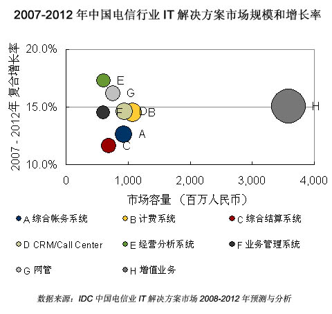 IDC預(yù)計(jì),2007-2012年電信行業(yè)將注重運(yùn)營(yíng)支撐系統(tǒng)的全業(yè)務(wù)運(yùn)營(yíng)整合和支持前端業(yè)務(wù),因此3G增值業(yè)務(wù)、經(jīng)營(yíng)分析系統(tǒng)、客戶關(guān)系管理系統(tǒng)、IT服務(wù)管理系統(tǒng)等建設(shè)將實(shí)現(xiàn)快速增長(zhǎng)。已有項(xiàng)目仍然會(huì)持續(xù)升級(jí)維護(hù),以及配合全業(yè)務(wù)運(yùn)營(yíng)作出功能上的提升。2007年電信IT應(yīng)用解決方案(僅含解決方案供應(yīng)商自有軟件及其相關(guān)服務(wù)包括BSS/OSS/MSS/VAS)市場(chǎng)規(guī)模為97.27億元人民幣,占整體電信軟件和服務(wù)市場(chǎng)容量的74.5%。2012年電信行業(yè)IT解決方案整體市場(chǎng)規(guī)模將達(dá)到193.5億元人民幣。