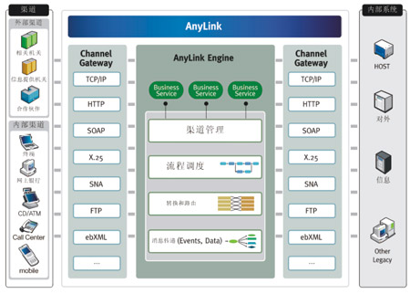 通過基于AnyLink的電子渠道統(tǒng)一接口平臺解決方案提供各類網(wǎng)關(guān)功能,可實現(xiàn)各種系統(tǒng)的整合,還提供報文轉(zhuǎn)換及路由的中介功能、管理和監(jiān)控所需的GUI工具,實現(xiàn)系統(tǒng)運營和維護(hù)及開發(fā)的最佳化(如圖所示)。