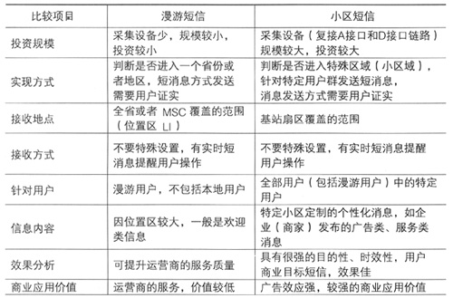兩個(gè)系統(tǒng)最大的不同點(diǎn)是接收短信的范圍和用戶不一樣,漫游短信是針對(duì)漫游用戶在一個(gè)相對(duì)較大區(qū)域內(nèi),因此只適合運(yùn)營商發(fā)一般性的問候短信,提高運(yùn)營商的服務(wù)質(zhì)量;小區(qū)短信則是在一個(gè)較小的區(qū)域內(nèi)(特定地點(diǎn)),針對(duì)特定用戶(可能包括漫游用戶),在一個(gè)特定的時(shí)間,發(fā)送特定的消息,因此這種消息具有較強(qiáng)的針對(duì)性,具有較高的商業(yè)用戶價(jià)值,可用于企業(yè)(商家)發(fā)布廣告和服務(wù)類的信息,能夠成為一種典型的增值服務(wù)。