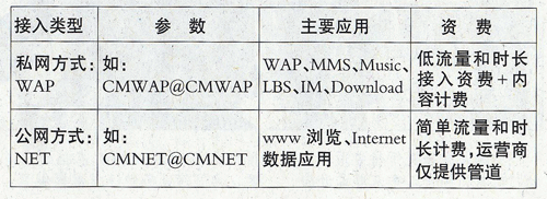目前,運(yùn)營(yíng)商采用兩種接入方式(WAP和NET)接入移動(dòng)互聯(lián)網(wǎng),如表所示:
