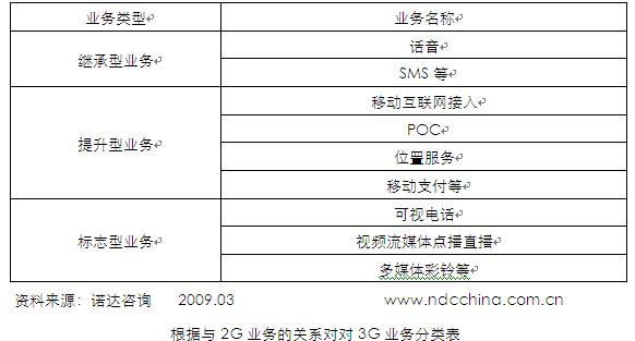 根據(jù)用戶對3G業(yè)務(wù)的體驗(yàn),其與2G業(yè)務(wù)的關(guān)系可以分為:繼承型業(yè)務(wù)(話音、SMS等)、提升型業(yè)務(wù)(移動互聯(lián)網(wǎng)接入、POC、位置服務(wù)、移動支付、整首歌曲下載等)、標(biāo)志型業(yè)務(wù)(可視電話、視頻流媒體點(diǎn)播直播、多媒體彩鈴、視頻會議等)