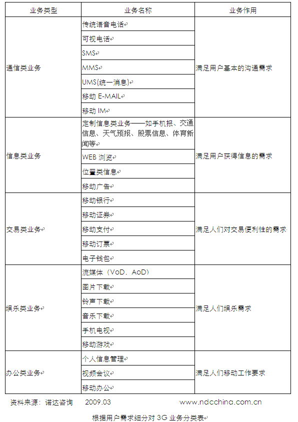從個體用戶橫向需求角度對業(yè)務(wù)進(jìn)行劃分,3G業(yè)務(wù)可以分為五大類,主要包括五類通訊類業(yè)務(wù)、信息類業(yè)務(wù)、交易類業(yè)務(wù)、娛樂類業(yè)務(wù)、辦公類業(yè)務(wù)。諾達(dá)咨詢《3G發(fā)展報告系列——全球3G業(yè)務(wù)與運(yùn)營市場發(fā)展研究報告2009》認(rèn)為該種一方面考慮了企業(yè)業(yè)務(wù)發(fā)展相近性和規(guī)模效應(yīng),另一方面考慮的用戶的不同需求特性,把一個用戶多種需求分割開來,以實(shí)現(xiàn)低成本的使需求得以滿足。是一種傳統(tǒng)的業(yè)務(wù)分類方法,適合傳統(tǒng)技術(shù)條件下的合作分工的市場及產(chǎn)業(yè)環(huán)境。這種分類方法利于業(yè)務(wù)的設(shè)計及推出。
